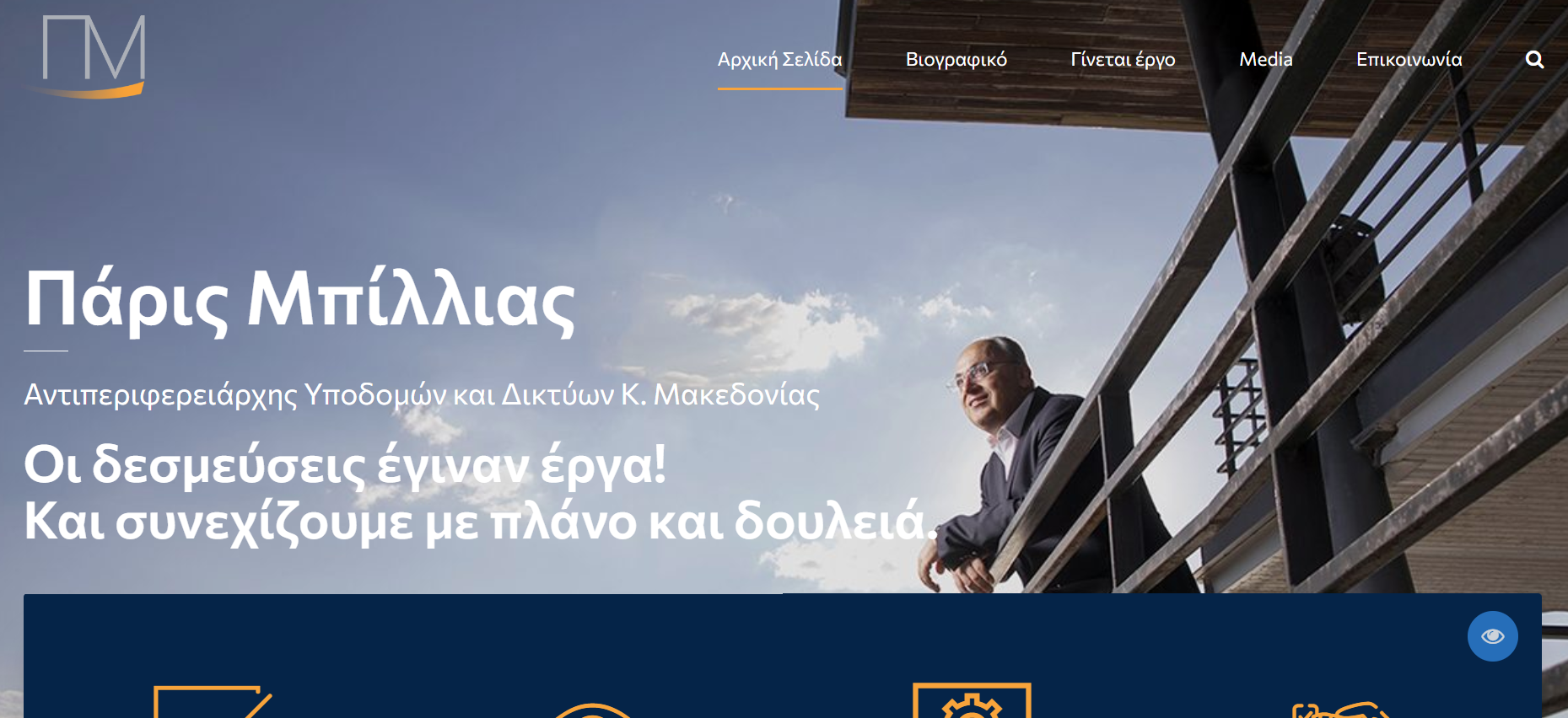 Ο Πάρις Μπίλλιας είναι Αντιπεριφερειάρχης Υποδομών και Δικτύων Κ. Μακεδονίας και ένας άνθρωπος ρεαλιστής και αισιόδοξος. Ξεκινήσαμε τη συνεργασία μας περίπου ένα χρόνο πριν τις Περιφερειακές εκλογές, προκειμένου να αναβαθμίσουμε την επικοινωνία του με το κοινό της Θεσσαλονίκης δημιουργώντας ένα σύγχρονο και λιτό website. Σκοπός μας ήταν να γίνει γνωστό το σημαντικό και δύσκολο έργο του ίδιου στην Περιφέρεια Κεντρική Μακεδονίας και να σκιαγραφήσουμε το προφίλ του ικανού μηχανικού και αποτελεσματικού πολιτικού.